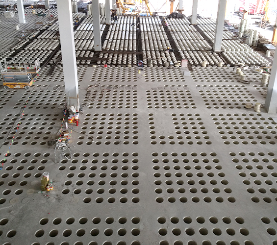 結構留孔:作為模板,澆筑混凝土后形成均勻圓形孔洞,構成奇氏板(華夫板) 結構。